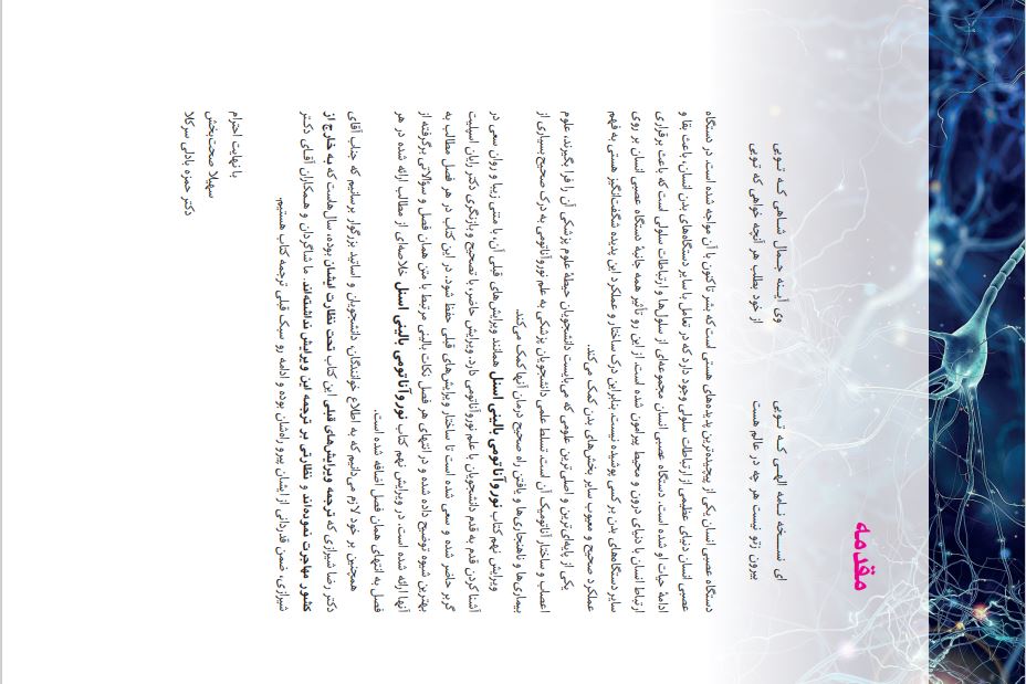 این کتاب ترجمه ی ویرایش نهم نوروآناتومی بالینی اسنل است.. این کتاب دربرگیرنده ی پایه ای ترین نکات علمی نوروآناتومی است که برای حرفه پزشکی ضروری است. در این ویرایش نویسنده ی کتاب تغییر یافته است. مطالب هر فصل مرور و ویرایش شده تا نکات نوروآناتومی به بهترین نحو ارائه شوند. تصاویر قبلی کتاب به روز شده و رنگ بندی آن ها تغییر یافته تا مطالب ارائه شده در هر تصویر گویاتر شوند.تصاویر MRI و میکروگراف های بافت شناسی با کیفیت بالا تهیه شده اند تا اطلاعات بصری دقیق تری ارائه دهند.